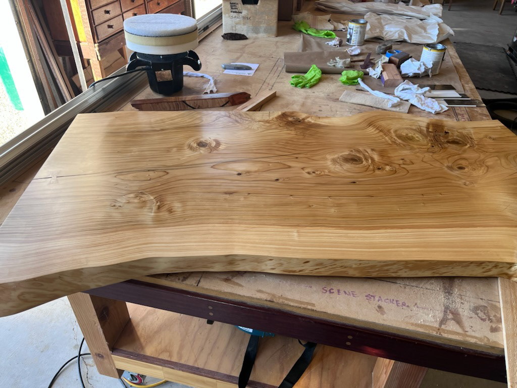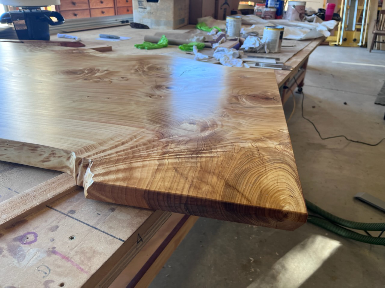 Cedar slab work desk top for electric sit/stand base. 22.5° chamfered underside edges, Osmo Polyx-Oil Hard Wax finish
